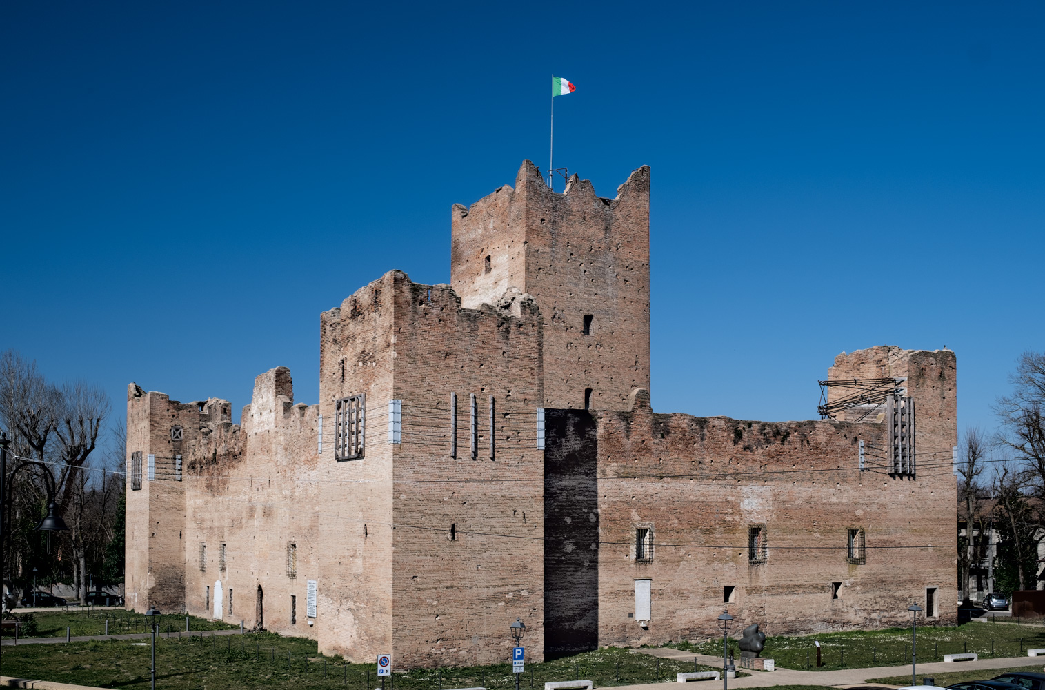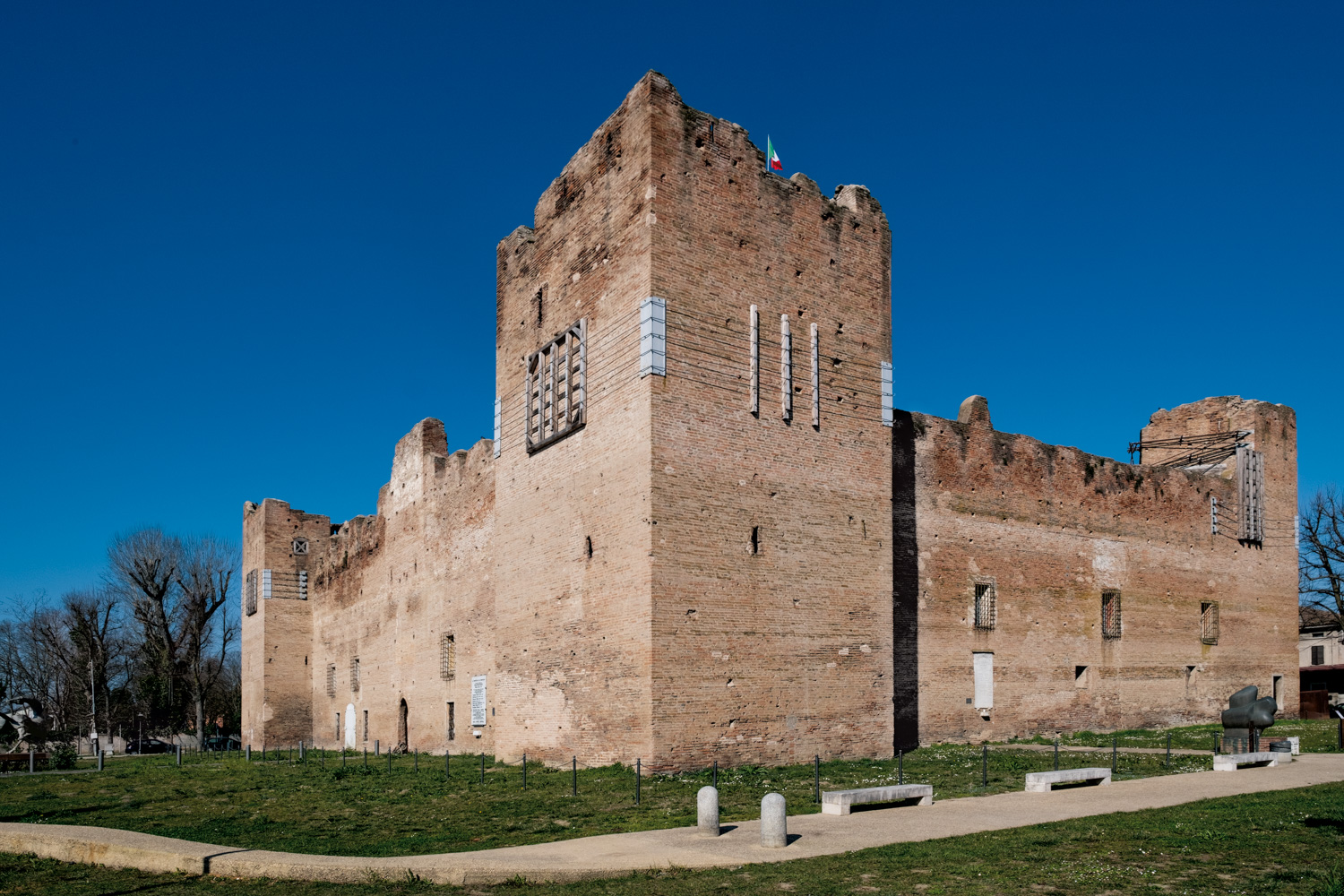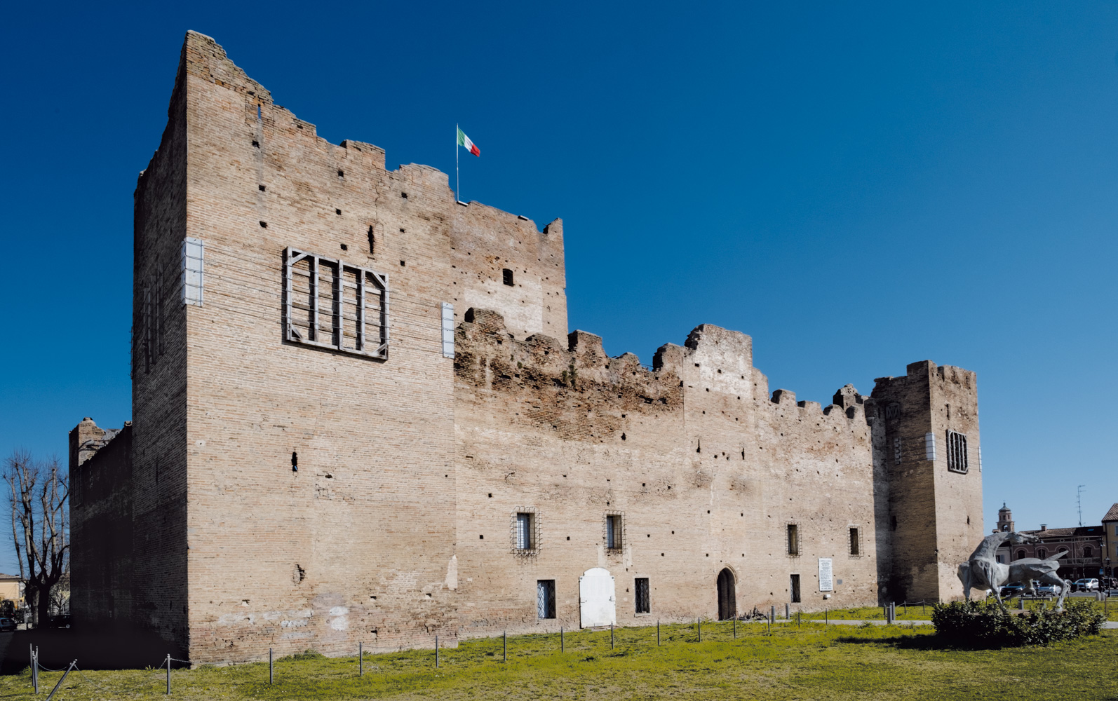 All’esterno, la Rocca era difesa da un profondo fossato che circondava anche la parte abitata a nord, denominata “castello”, cinta da mura e collegata alla Rocca con un piccolo ponte levatoio. Il fossato di difesa, alimentato con l’acqua del vicino canale Tagliata, veniva così ad assumere la forma di un grande “otto” che circondava (e separava) in tutto il suo perimetro il complesso fortificato e quello abitato.